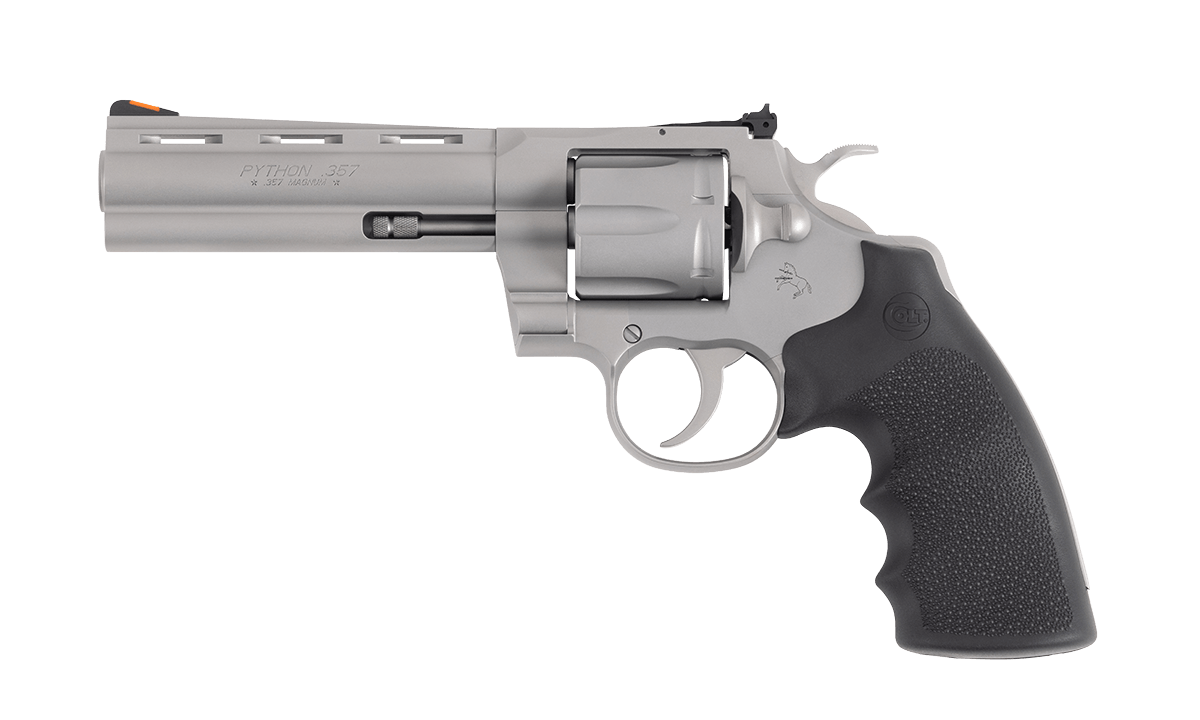 Building on Colt’s Snake Gun legacy, the legendary double-action revolver is now available in stainless steel in 2” barrel lengths. The Python features a matte finish and a redesigned rear sight. Thirty percent more steel beneath the rear adjustable target sight gives you a stronger revolver and more robust shooting experience. A recessed target crown, user-interchangeable front sight, and recoil absorbing, interchangeable, Hogue® OverMolded rubber grips make this a gun you’ll want to shoot AND show off. The Python is chambered in 357 Magnum and accommodates 38 Special cartridges.